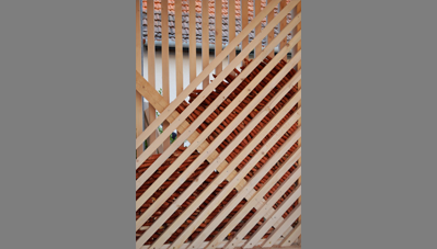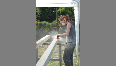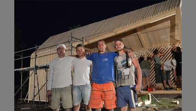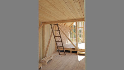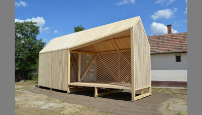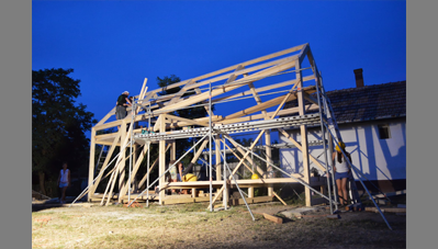 alapozást előre elkészítettük a helyiekkel, hogy csak a faszerkezetre koncentrálhassunk. Először a keretállások és a merevítő szerkezetek készültek el, majd a rácsozat, illetve a kukoricacsutka került