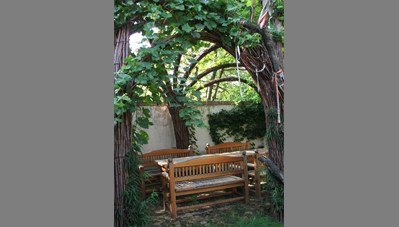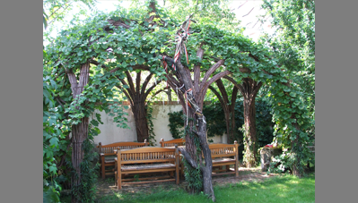A Kecske utcai Makovecz főhadiszállás kertjében állt egy fából készült pergola.