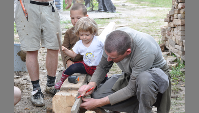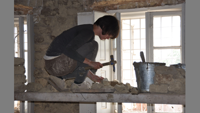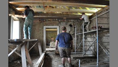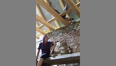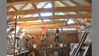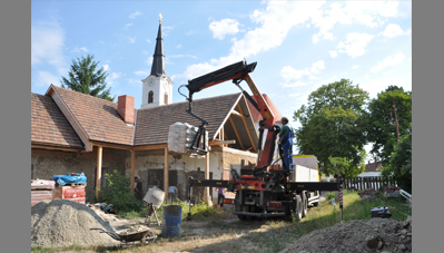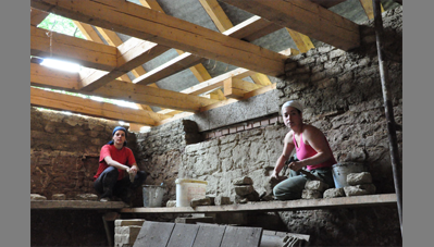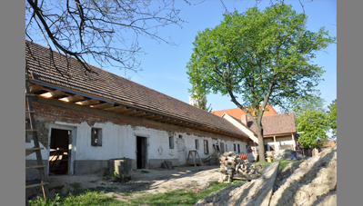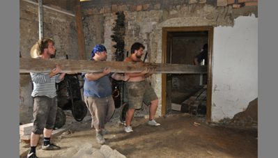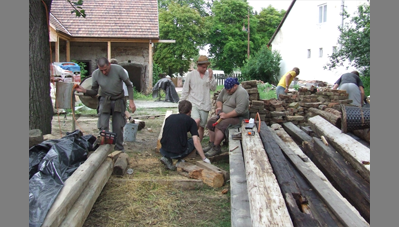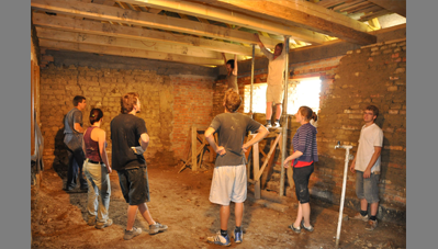 A Szent Erzsébet templom mellett lévő hosszú parasztházat az önkormányzat átadta a Hagyományőrző Egyesületnek és a Bokréta Néptáncegyüttesnek, jórészt az önkéntes munkával végzett felújításért és tényleges üzemeltetésért cserébe. Húszéves kapcsolatot ápolunk a Bokréta szellemi motorjával, a szintén építész Fülöp Vilmossal. Javaslatára szerveződött a tábor, amelynek során bekap-csolódtunk a vályogból épült közösségi ház felújításába. A hallgatók vályogtéglával falaztak, részleges aláfalazásokat végeztek, egy helyen kicserélték a fafödémet és rendbe tették az épület tapasztott udvari homlokzatát.
